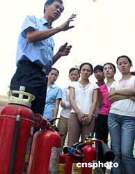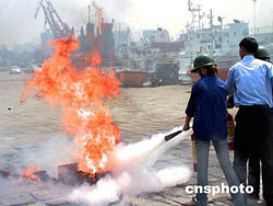 中國第一列跨海火車客運列車即將開通,應聘的列車乘務員們九月中旬接受海南海事局海船船員專業(yè)知識培訓,這是消防教員在講解滅火器的操作。據(jù)了解,這些乘務員將成為國內(nèi)第一批擁有海船船員資格證書,同時服務于陸地與跨海運輸?shù)幕疖嚦藙諉T。作者:關向東