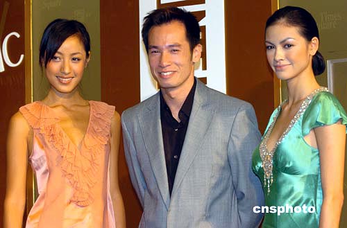 香港藝員陳豪(中)與名模蔣怡(左)﹑Rosemary14日出席香港時代廣場“時代b2”開業(yè)儀式。