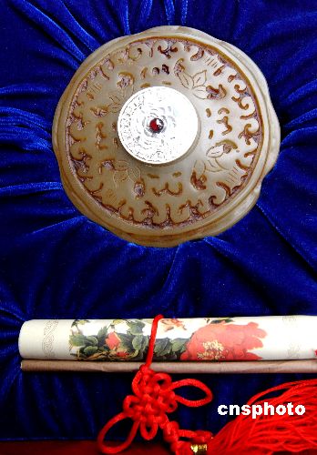 2004年9月14日,鄭州,一位銷售人員在展示一款由純天然巴林玉石璧和純銀組成的月餅,月餅天然寶石。這款月餅目前售價8000元左右。馬健 攝