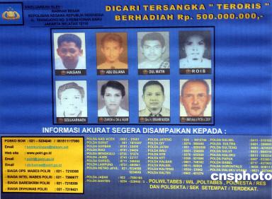 其中,包括在逃的“伊斯蘭團(tuán)”炸彈專家阿扎哈里·胡辛和恐怖要犯諾丁·穆罕默德·托普,他們分別被懸賞10億印尼盧比亞(約合10萬美元),其他8名嫌犯的懸賞額為5億盧比亞。