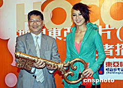 東亞唱片集團(tuán)董事廖毅榮會(huì)上頒發(fā)金鑰匙予何韻詩(shī),寓意雙方合作憑金鑰匙打開(kāi)勝利之門(mén)。
