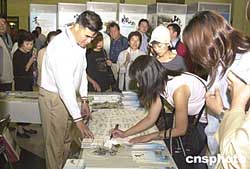 九月十九日在東京鐵路客站大廳舉行的“二零零八相約奧運(yùn)揚(yáng)帆青島”推介展示活動(dòng),吸引了眾多日本民眾。他們?cè)谡古_(tái)前排起長(zhǎng)隊(duì)索取資料,并在一塊象征奧運(yùn)帆船賽揚(yáng)帆青島的白色帆布上簽名,表示關(guān)注和支持。作者:王健