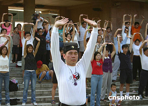 除了表演外,兩岸武當高手們今天還現(xiàn)場傳授武當養(yǎng)生功法。這套源自于六百年前,由武當派祖師張三豐所創(chuàng)的太極拳法,化有形為無形,最具道家武術(shù)精髓,被稱為“內(nèi)家的祖庭”。在教練的帶領(lǐng)下,只見全場民眾起立,微屈雙膝,徐展臂掌,吐故納新。