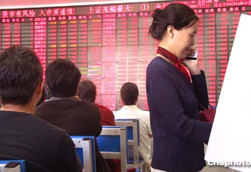 | 受利好消息的良性影響,九月二十日(周一),中國滬深股市大盤呈現(xiàn)出放量上漲的滿堂紅景觀。該日,北京股民神態(tài)自若地在證券營業(yè)部內(nèi)進(jìn)行交易。當(dāng)日兩市共成交約419億,比上一個(gè)交易日明顯放大。其中上證指數(shù)漲跌幅達(dá)+3.43%;上證B股指數(shù)漲跌幅達(dá)3.46%;深證成指漲跌幅達(dá)3.76%;深證成份B指漲跌幅達(dá)4.07%。中新社記者:鄒憲