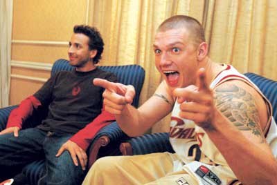昨天,高大粗壯的Nick和瘦小精干的Howie在兩名保鏢的護衛(wèi)下出現(xiàn)在北京飯店。跟剛下飛機的時候不一樣,Howie換成了一身短打扮,而高大的Nick則穿著一件籃球背心、運動褲,儼然一位美國NBA的灌籃高手。不過,他的寬大裸露的肩上大片的刺青引起了記者們的注意,特別是圖案中間刺著的兩個漢字——“海神”。跟莊重嚴肅的保鏢顯然不同,他們對媒體記者絲毫沒有敵意,面對鏡頭非常配合地做著各種幽默甚至滑稽的動作和表情。