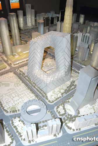 | 經(jīng)過多次反復(fù)和調(diào)整,占地近十九公頃的中央電視臺新大樓于九月二十二日在北京CBD奠基,正式從設(shè)計圖紙轉(zhuǎn)入建設(shè)期。新大樓的方案由荷蘭大都會建筑事務(wù)所著名設(shè)計師庫哈斯設(shè)計,“側(cè)面S正面O”的特異造型此前引起眾多爭議。建成后每天將有超過一萬名員工在樓內(nèi)工作,可以容納約二百五十個頻道。圖為央視新樓及周邊地區(qū)效果模型。作者:徐曦弋