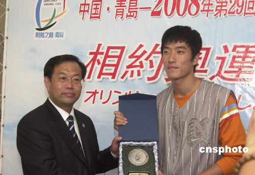 二十二日下午抵達(dá)二00四國(guó)際田聯(lián)全明星賽橫濱賽之前,匆匆途經(jīng)正在橫濱中華街內(nèi)舉行的“揚(yáng)帆青島、相約奧運(yùn)”巡回展展場(chǎng),為其熱情助陣。圖為劉翔在現(xiàn)場(chǎng)接受二00八年奧運(yùn)會(huì)帆船比賽賽地青島市贈(zèng)送的比賽紀(jì)念牌。 作者:王健