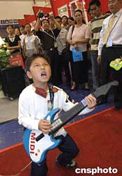 九月二十三日,一位彈吉它的搖滾小朋友在青島會展中心為在這里舉行的2004青島國際時裝周助興。作者:史利