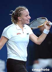 九月二十三日晚在北京舉行的首屆中國網(wǎng)球公開賽WTA巡回賽女單比賽中,新科美網(wǎng)冠軍庫茲涅佐娃經(jīng)過三盤苦戰(zhàn),險勝中國選手李娜后,欣喜不已。作者:武仲林