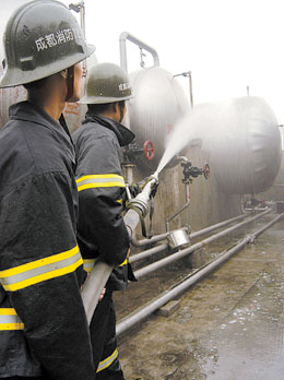 成都市消防支隊(duì)緊急調(diào)集城區(qū)10個中隊(duì)共40輛消防車趕往現(xiàn)場,并立即啟動“104油庫應(yīng)急預(yù)案”。幾分鐘之后,油庫周圍的居民全部撤離,接著便看見鳴著警笛的消防車接連不斷地開進(jìn)了油庫。
