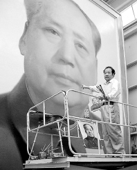 按照慣例,每年國(guó)慶節(jié)前,天安門(mén)城樓的毛澤東主席畫(huà)像都要更換,今年也不例外。自1977年就一直擔(dān)負(fù)畫(huà)主席像工作的畫(huà)家葛小光已在畫(huà)室半個(gè)多月,目前這幅長(zhǎng)6米、寬5米的油畫(huà)已近尾聲。葛小光說(shuō),由于主席像掛在戶外,經(jīng)受風(fēng)吹日曬,所以這幅油畫(huà)的顏色和造型需要技巧,盡量減少季節(jié)、光照等因素的影響,掛上去后無(wú)論從哪個(gè)角度看都不會(huì)有太大變化。如果天氣沒(méi)有變化,27日晚將掛上城樓。
