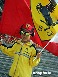 九月二十五日,F(xiàn)1中國站排位賽在上海國際賽車場舉行,吸引數(shù)十萬中外車迷。圖為上海小車迷將F1紀(jì)念品全副武裝到位。作者:潘索菲
