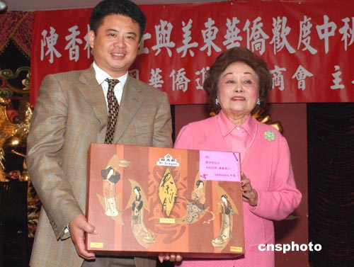 美東時(shí)間二十四日中午,著名美籍華人陳香梅從華盛頓趕到紐約,與美東華僑一起歡度中秋佳節(jié)。美國(guó)華商會(huì)會(huì)長(zhǎng)鄧龍?jiān)诼?lián)誼會(huì)上向陳香梅(右)贈(zèng)送精制的月餅。 龔文謨 攝