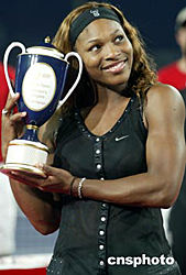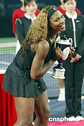 九月二十六日晚,中國網(wǎng)球公開賽女子單打決賽在北京網(wǎng)球中心中央球場進行,美國網(wǎng)壇名將小威廉姆斯以二比一戰(zhàn)勝美網(wǎng)新后、俄羅斯名將庫茲涅佐娃,摘得桂冠。中新社記者:盛佳鵬