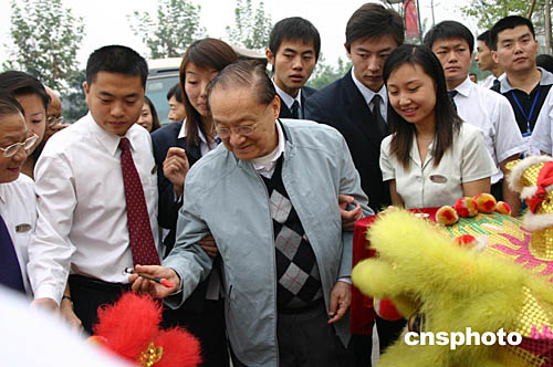香港文壇巨擘金庸九月二十七日下午來到成都芙蓉古城參觀民居民風(fēng),這是他在芙蓉古城大門為迎接的醒獅點(diǎn)睛。作者:魯彥