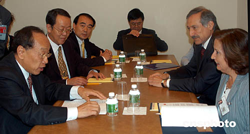 當(dāng)?shù)貢r(shí)間九月二十七日,出席第五十九屆聯(lián)大的中國(guó)外長(zhǎng)李肇星(左)在紐約聯(lián)合國(guó)總部會(huì)見(jiàn)了智利外長(zhǎng)索萊達(dá)·阿爾韋亞爾(右)。作者:趙海燕