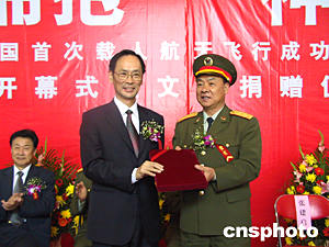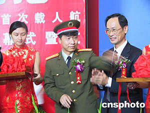 由中國人民解放軍總裝備部、文化部等共同主辦的“擁抱‘神舟’——紀(jì)念中國首次載人航天飛行成功一周年展覽”二十九日在國家博物館開幕。展覽中傳遞的信息稱,根據(jù)計劃,“神舟”六號載人飛船將在明年發(fā)射升空,目前,中國航天人正信心百倍地投入“神舟”六號的研制工作中。中新社記者 孫自法 攝