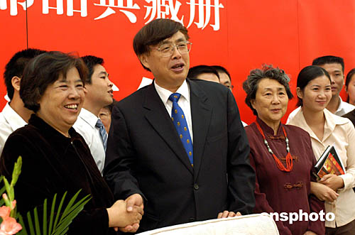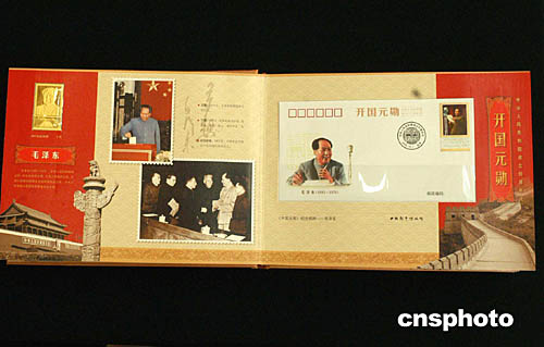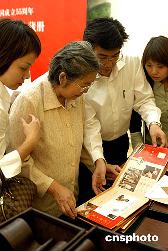 在慶祝中華人民共和國成立五十五周年之際,毛澤東的女兒李敏(左二)及孔繼寧(李敏之子)(左三)、孔東梅(李敏之女)(左一),九月二十九日以開國元?jiǎng)子H屬和嘉賓身份,在北京人民大會(huì)堂出席《開國元?jiǎng)住方疸y郵品典藏冊(cè)首發(fā)式和新聞發(fā)布會(huì),并一起欣賞這部由中國郵票博物館出版發(fā)行的典藏冊(cè)。