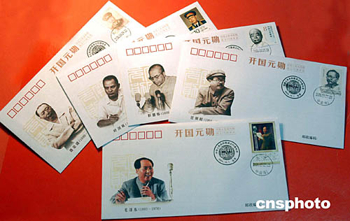 | 在慶祝中華人民共和國成立五十五周年之際,中國郵票博物館九月二十九日出品發(fā)行了一套十五枚《開國元?jiǎng)住方佡|(zhì)紀(jì)念封!堕_國元?jiǎng)住方佡|(zhì)紀(jì)念封其中印有毛澤東、周恩來、劉少奇、朱德、任弼時(shí)、鄧小平、陳云、彭德懷、劉伯承、賀龍、陳毅、羅榮桓、徐向前、聶榮臻、葉劍英等開國元?jiǎng)椎纳顖D象和貼有相應(yīng)肖像郵票。這套絹質(zhì)紀(jì)念封也被收納在中國郵票博物館于當(dāng)日發(fā)行的《開國元?jiǎng)住方疸y郵品典藏冊(cè)之中。中新社記者:鄒憲