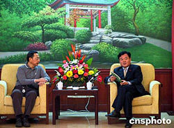 湖南省副省長(zhǎng)賀同新(右)九月三十日在長(zhǎng)沙會(huì)見(jiàn)全國(guó)政協(xié)委員、香港興業(yè)集團(tuán)董事會(huì)副主席查懋聲一行。查懋聲來(lái)湘是為了考察湖南株洲市一個(gè)總投資額近七億元的房地產(chǎn)項(xiàng)目。作者:鄧霞