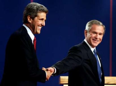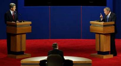 兩位候選人,一位是總統(tǒng),一位是參議員,皆出自富家名校,又都伶牙俐齒,在辯論場上也已身經(jīng)百戰(zhàn),不過,布什作為在任總統(tǒng),又在民意調(diào)查中小占上風(fēng),加上在伊拉克戰(zhàn)爭上、尤其在反恐工作中得到許多選民認(rèn)可,他似乎只要在辯論中保持不敗即可站穩(wěn)腳跟。