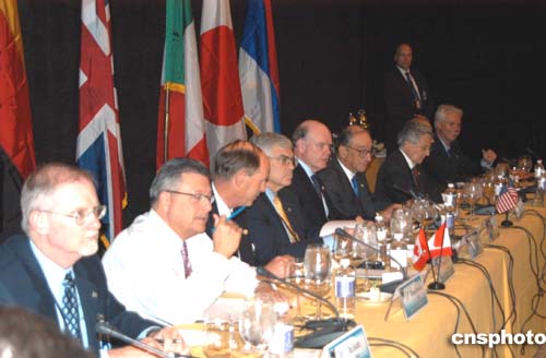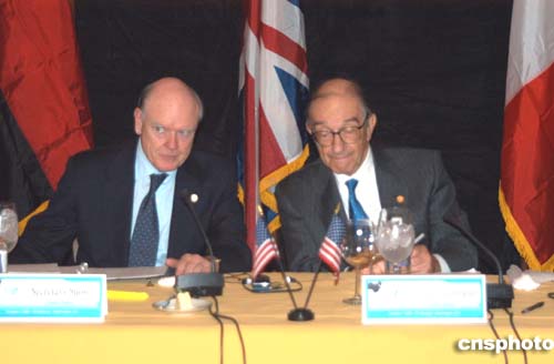 美國財(cái)長斯諾(左)與美聯(lián)儲(chǔ)主席格林斯潘(右)1日參加G7與中國的首次部長級對話會(huì)。中新社記者:余東暉