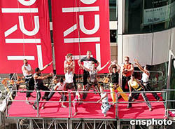 穿上時(shí)尚品牌ESPRIT 2004秋冬運(yùn)動(dòng)時(shí)裝的模特,10月4日在香港尖沙咀美麗華商場(chǎng)外墻舞臺(tái)上表演,展示優(yōu)美姿態(tài),為該品牌運(yùn)動(dòng)系列宣傳。作者:洪少葵