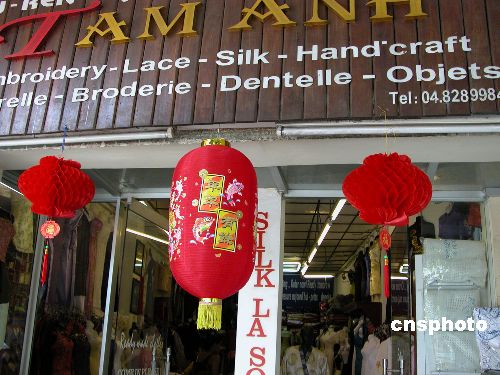越南文化與漢文化有千年情結(jié)。越語中漢文化的影響首先是越南的姓氏,越南人大都有一個漢語化的姓再加上一個名。此外,越南人至今保持著過端午節(jié)、春節(jié)的習(xí)俗。圖為河內(nèi)街頭的一家服裝店門口掛著大紅的燈籠,燈籠上寫著“年年有余”的漢字。吳慶才 攝