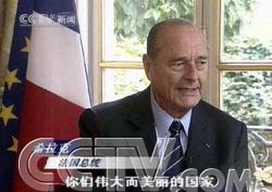 記者水均益:這里是法國首都巴黎,凱旋門、香榭麗舍大道以及在我前方的協(xié)和廣場和盧浮宮,這些都是法蘭西這個(gè)美麗的歐洲國家的靈魂體現(xiàn)。80多年前,周恩來、鄧小平、朱德等新中國的創(chuàng)立者們來到法國,尋找革命的真理;40年前法國總統(tǒng)戴高樂在愛麗舍宮作出決定,與新中國建立正式的外交關(guān)系,法國成為第一個(gè)與中華人民共和國建立大使級(jí)外交關(guān)系的西歐大國。40年過去了,無論世界風(fēng)云如何變幻,中法兩國的關(guān)系始終朝著健康、良好的方向發(fā)展。10月8號(hào),法國總統(tǒng)希拉克將對我國進(jìn)行第五次訪問。我們現(xiàn)在就走進(jìn)愛麗舍宮,對臨行前的希拉克總統(tǒng)進(jìn)行獨(dú)家專訪,聽聽這位法國領(lǐng)導(dǎo)人如何看待當(dāng)今的中法關(guān)系和我們所處的這個(gè)世界。