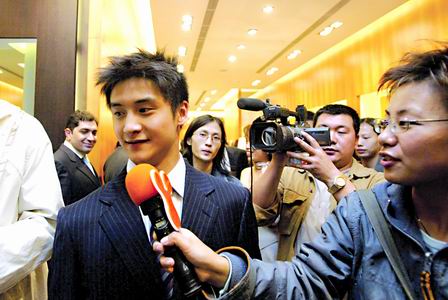 當(dāng)“跳水王子”身著筆挺的意大利西裝走到簽到臺前時,記者們瘋了似地沖將過去,電視臺的編導(dǎo)激動地將話筒伸到田亮嘴邊,讓他說說郭晶晶,談?wù)劯凵。雙眼略顯紅腫的田亮在經(jīng)紀(jì)人的保護(hù)下低頭讓過,對任何問題不予應(yīng)答。經(jīng)紀(jì)人劉先生稱,田亮剛剛從美國乘坐了34個小時的飛機(jī)到達(dá)北京,其間轉(zhuǎn)乘了4個航班,非常勞累,因此不便接受采訪。(記者 胡雪柏王錚)