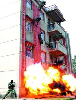 驚心動(dòng)魄的反劫持人質(zhì)“戰(zhàn)斗”打響了!5名“恐怖分子”作案后,駕駛一輛面包車劫持3名“人質(zhì)”逃竄。特勤中隊(duì)接到上級(jí)命令后,立即兵分兩路,一路在各主要路口設(shè)障攔截,一路沿“歹徒”逃離方向?qū)嵤┳窊。在走投無(wú)路的情況下,“歹徒”劫持“人質(zhì)”竄到某單位一辦公樓。在雙方對(duì)峙不下時(shí),根據(jù)上級(jí)指示,特勤中隊(duì)采取強(qiáng)行突擊。說(shuō)時(shí)遲,那時(shí)快,一聲巨響后,戰(zhàn)士們空中突降,從窗口魚躍而入,隨著幾聲槍響,“歹徒”們死的死,傷的傷,全被制服,3名“人質(zhì)”安然無(wú)恙,演練場(chǎng)內(nèi)再次掌聲如潮……