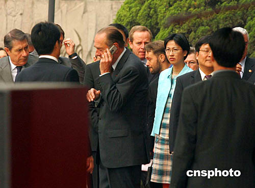 十月十一日,法國(guó)總統(tǒng)希拉克訪問(wèn)上海,圖為他在繁忙的行程中接聽(tīng)手機(jī)。作者:潘索菲