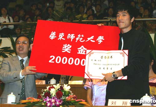已成為世界級體育明星的劉翔目前仍是上海華東師范大學(xué)法政學(xué)院二○○一級本科在讀生。今天正值學(xué)校五十三周年校慶,又是本年度推薦免試直升研究生資格的最后一天,劉翔在指導(dǎo)教練孫海平的陪伴下簽署了相關(guān)文件。