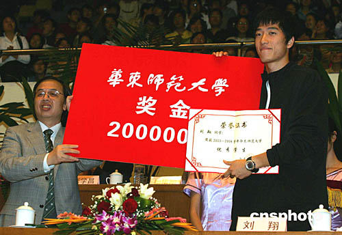 雅典奧運會男子一百一十米欄冠軍劉翔(右),十月十三日被上海華東師范大學授予“優(yōu)秀學生”稱號,并被推薦免試直接升入該校研究生,且碩士、博士連讀,同時獲得人民幣二十萬元獎勵。劉翔現(xiàn)為該校四年級學生。圖為該校校長王建磐向劉翔頒獎。作者:潘索菲