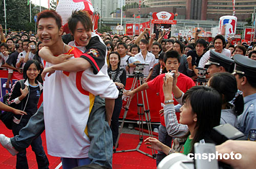 NBA中國(guó)大賽十月十四日即將在上海體育館舉行。十三日舉行的“可口可樂(lè)NBA嘉年華”出現(xiàn)火爆追星情形?煽诳蓸(lè)形象代言人潘瑋柏一見中國(guó)男籃隊(duì)球員易健聯(lián)便跳躍在其背上,引起上海追星族歡呼和現(xiàn)場(chǎng)混亂。作者:潘索菲