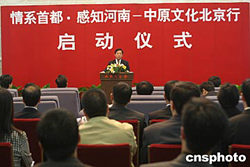 十月十四日,由河南省主辦的“情系首都.感知河南--中原文化北京行”啟動儀式在北京人民大會堂舉行。首次來京舉辦的一系列大型文化交流和宣傳活動,將展示河南悠久的歷史、美麗的河山、燦爛的文化以及改革開放的成就。圖為河南省委副書記王全書在介紹河南情況。中新社記者:史利