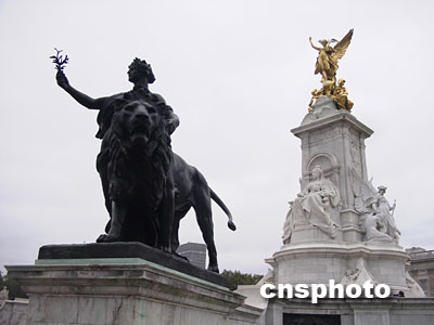 英國白金漢宮正面廣場外的維多利亞女王雕像。金色的雕像矗立高端,為手持權(quán)杖的天使形象。余瑞冬 攝