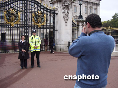 在白金漢宮門前,面帶微笑的英國警察(黃衫者)成了各國游客合影的對象。余瑞冬 攝