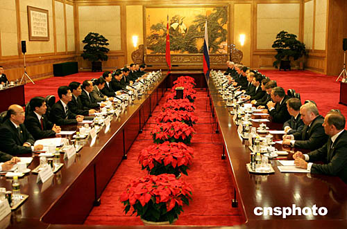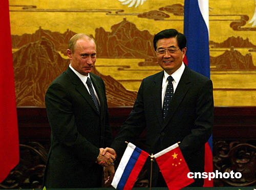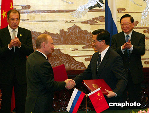 普京完全贊同胡錦濤的看法和建議,他說,發(fā)展俄中合作是俄一貫政策!抖碇心类徲押煤献鳁l約》為兩國關(guān)系發(fā)展奠定了重要基礎(chǔ),雙方解決邊境問題、就俄加入世貿(mào)組織達成協(xié)議是兩國戰(zhàn)略協(xié)作伙伴關(guān)系的體現(xiàn)。我們愿與中方切實落實該條約的實施綱要,推動雙方在各領(lǐng)域的合作。俄方希望加強經(jīng)貿(mào)合作,爭取在數(shù)量和質(zhì)量上均不斷提高。他重申,俄方關(guān)于同中國的能源合作的決定始終未變,也愿同中國加強在科技、人文等領(lǐng)域的合作。