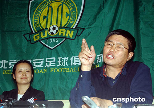 北京國安足球俱樂部有限責(zé)任公司首席律師王玉梅(左)在會上宣布國安正式啟動向中國足協(xié)的申訴程序,總經(jīng)理楊祖武(右)向媒體傳達(dá)了俱樂部董事會決定用法律手段解決與中國足協(xié)矛盾的決心。