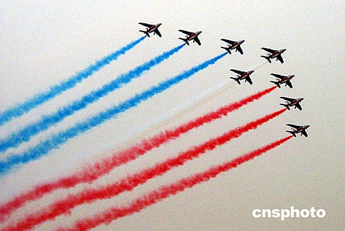 法國空軍“法蘭西巡邏兵”是當(dāng)今世界著名的五大特技飛行表演隊(duì)之一,與英國的“紅箭”、意大利的“三色箭”并稱為“歐洲三杰”。本次該飛行表演隊(duì)隨法國總統(tǒng)希拉克首次來華訪問,作為在中國舉辦的法國文化年重要活動(dòng)內(nèi)容之一,定在北京、武漢、香港和珠海四個(gè)城市進(jìn)行飛行表演。此前,飽受天氣困擾的“法蘭西巡邏兵”直至本月十一日才在北京進(jìn)行首演。