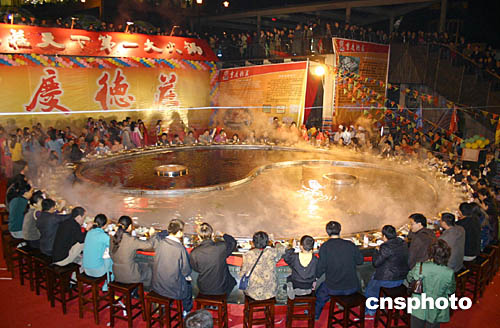 在有“天下第一大鍋”之稱的德莊大火鍋前,人頭攢動(dòng),熱鬧非凡,上千斤火鍋底料熬出的湯汁濃香撲鼻,讓人垂涎。重慶市人民政府副市長(zhǎng)謝小軍在開(kāi)鍋點(diǎn)火儀式上說(shuō),這天下第一大鍋有五十六個(gè)座位,象征著五十六個(gè)民族齊聚火鍋之都,品嘗這一山城美食。