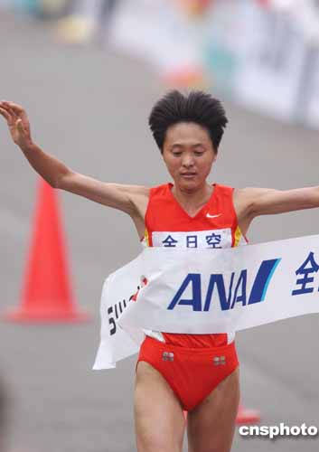 十月十七日,中國田徑名將孫英杰以2小時24分13秒的成績奪得北京國際馬拉松女子組冠軍。作者:武仲林