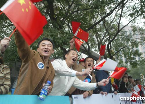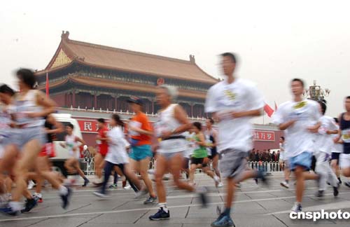 數(shù)十萬北京市民沿途為二零零四北京國際馬拉松賽的運動員吶喊加油。作者:武仲林