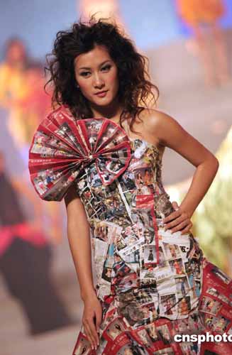 “青春中華”首屆中國(guó)青年服裝時(shí)尚周十月十七日晚在寧波開幕,模特與演員共舞霓裳羽衣,展示青春韻律。圖為模特展示青年設(shè)計(jì)師用報(bào)紙、筷子等材料制作的時(shí)裝。作者:毛建軍