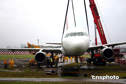 今晨本社記者透過機場圍墻看到,工作人員正在開動吊車吊起事故飛機。飛機距離機場圍墻只有數(shù)十米的距離,在草地中的機頭已被吊起,改變了飛機昨晚發(fā)生事故時尾巴翹起、機頭朝下的姿態(tài)。但截至發(fā)稿時,此間電視臺報道,拖離事故飛機的進程不甚順利。松山機場最快要到早上九點半才能恢復運營。