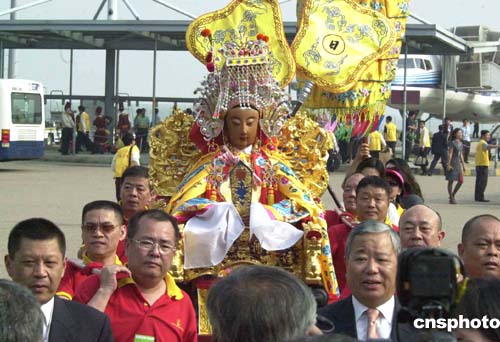 二十一日下午三時,湄洲媽祖金身乘搭專機從福州飛抵澳門,澳門中華媽祖基金會在澳門國際機場舉行隆重的接駕儀式,澳門中華媽祖基金會副主席陳明金等為媽祖金身披上金披鳳。