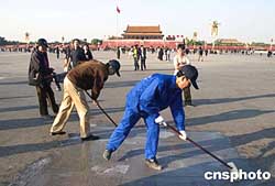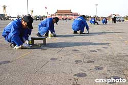10月23日,清潔工人正在北京天安門廣場對已經(jīng)發(fā)黑的花崗巖地面進(jìn)行清洗。清洗工作完成后,廣場地面將恢復(fù)淡粉色原貌。清洗工作原計劃在十天內(nèi)完成,但由于污漬太多,加上清理口香糖等污漬難度大,估計此次廣場大“洗臉”將會延期完成。作者:張煒