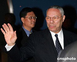 美國國務卿鮑威爾十月二十四日傍晚乘專機抵達北京,開始訪華行程。中新社記者:毛建軍