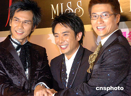 2004亞洲小姐競(jìng)選總決賽,于十月二十四日晚在香港演藝學(xué)院舉行,香港藝員陳啟泰(左)、梁思浩(中)、林韋辰(右)擔(dān)任競(jìng)選決賽司儀。中新社記者:錢興強(qiáng)